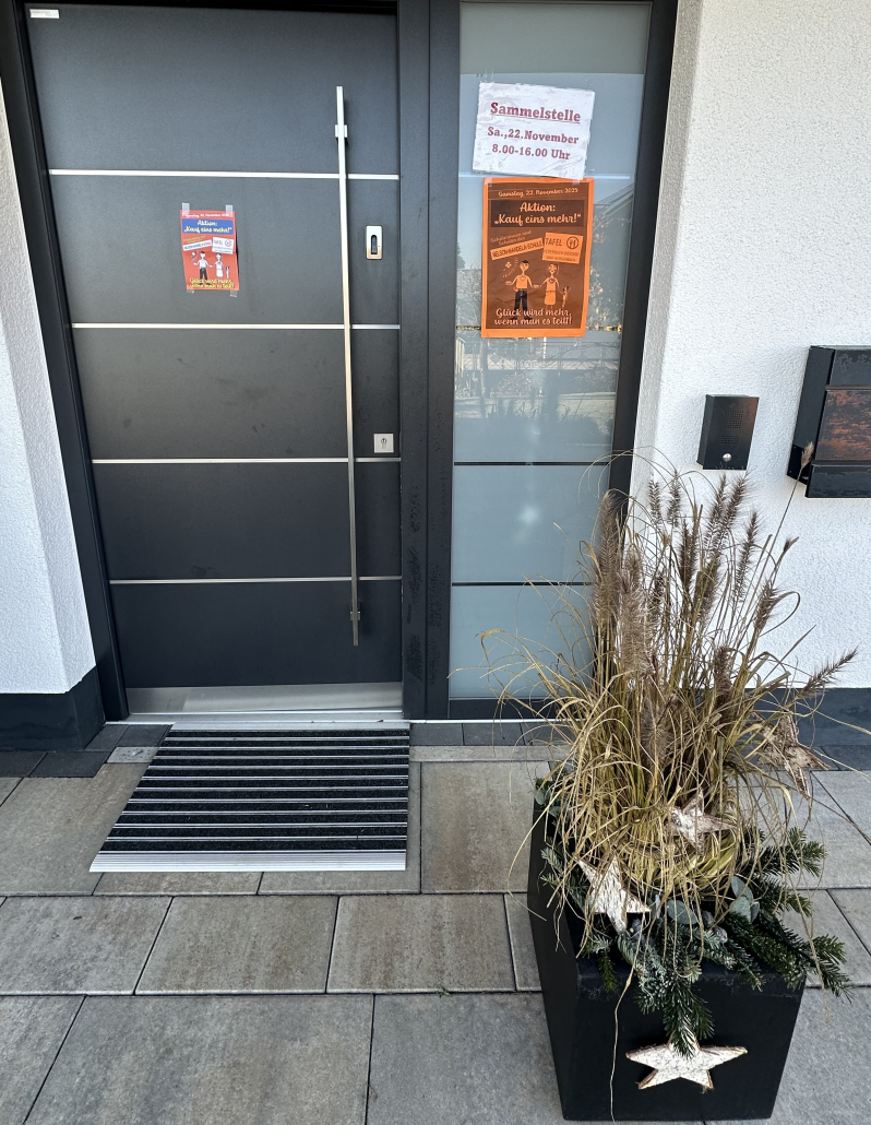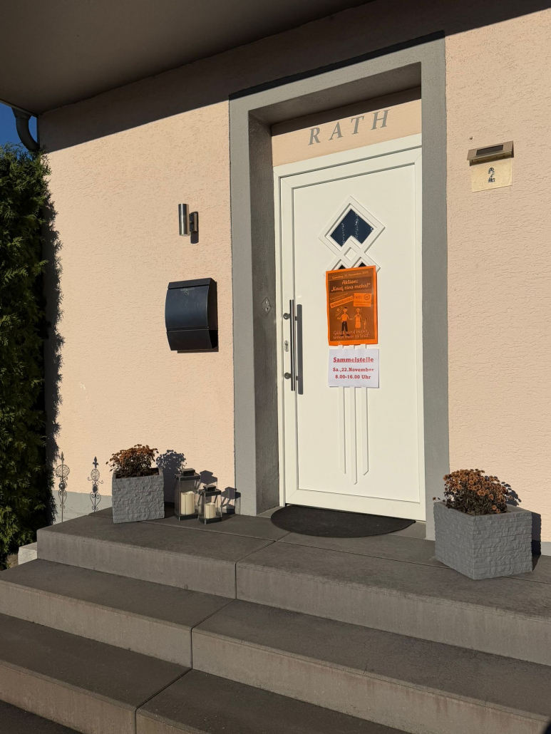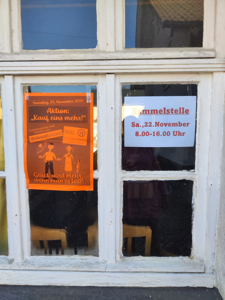 In Vorbereitung auf den Projekttag werden in den Wohnorten Flyer verteilt. Diese informieren über unser Projekt und bitten die Einwohner, am Samstag, 22.11.2025, in der Zeit von 8.30-16.00 Uhr haltbare Lebensmittel und Hygieneartikel an eine der Sammelstellen zu bringen.