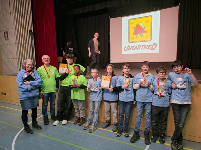 Das erste Team bestand aus sechs Schülerinnen und Schülern im Alter von 10 bis 11 Jahren, die alle zum ersten Malan der First Lego League teilnahmen. Trotz dieser Premiere schlugen sie sich bemerkenswert gut: Im Robot Game erzielten sie starke Ergebnisse und präsentierten ihren Forschungsauftrag souverän. Vorgestellt wurde die Idee einer Höhlendrohne, die bei archäologischen Ausgrabungen in schwer zugänglichen Höhlensystemen eingesetzt werden könnte. Die Präsentation überzeugte durch klare Struktur, Kreativität und große Begeisterung.